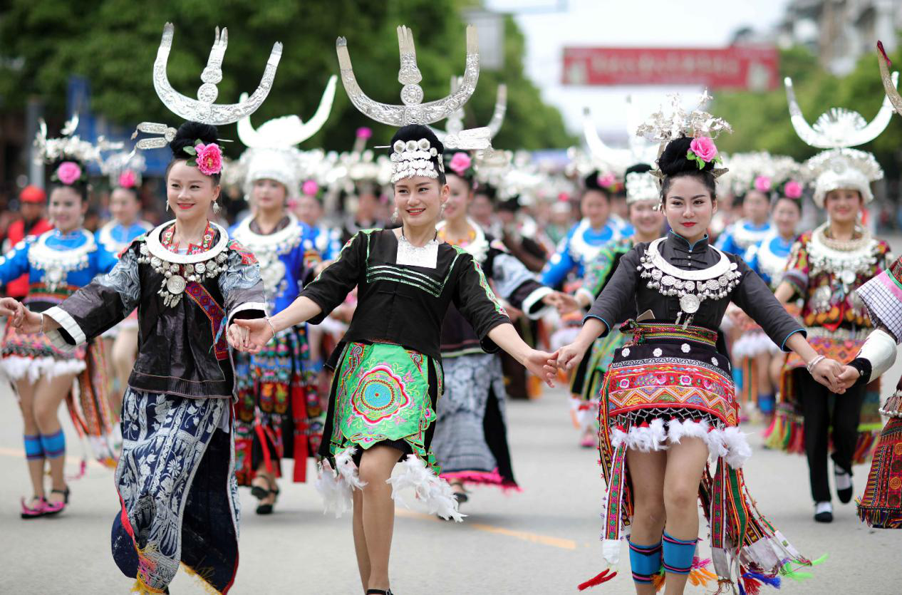 图为黔东南苗族侗族自治州丹寨县苗族村民身着盛装参加巡游活动
