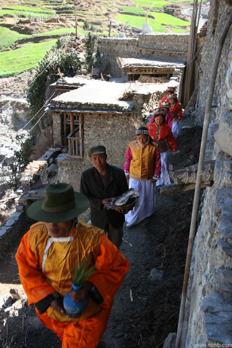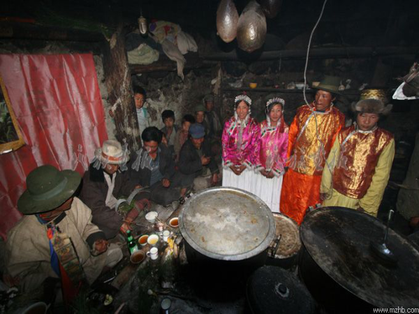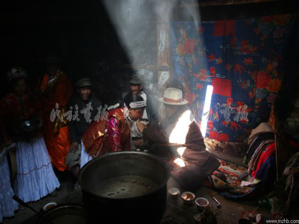 请完家神,吃过早饭,媒人带了两三人去新郎家接亲。在俄亚的婚礼中,媒人是一个非常重要的角色,并不是说新郎新娘是通过媒人的介绍认识并结的亲,而是这个媒人的属相要与新郎新娘的属相相合,并 且这个媒人要了解双方家庭情况,能掌控大场面,而且要能说会道。 此时的媒人已换上了他这个角色所特有的衣服,手里拿了两把青燕麦苗。从新娘家出发的时候接亲的人只有三四个,但是不久,就发现早 上在新娘家的很多人也已经来到了新郎家,包括新娘的父亲。在这期间火塘边的人低吟起一种曲调不变、即兴作词的歌,歌唱得很长,在歌声的烘托下,气氛有点感伤,我看到新郎在掉眼泪,旁边的几个妇 女也在悄悄地抹着眼泪。在新郎家,新娘接受来宾的礼物,这些礼物大多是自家织的麻布,有的再加几元钱。在俄亚,因为商业不发达, 物质也很困乏,所以,在很多需要送礼的场合,大家都会互赠自己家 织的麻布,麻布在一定意义上起着货币的作用。