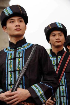 最典型的侗族男子服饰:黎平县黄岗地区的青年服饰,头包花格帕,为蓝、青、白色自织侗布,包法呈左右向上交叉状,包头较大。上衣为紫色闪光的特制侗布,款式独特。上衣无领,开襟从领口正中横向右侧二寸处,又直下至腰部,再向左横至正中,再直下到下摆。衣扣分圆银珠和蚕形布扣两种,六对,每对为双排扣。上衣短小贴身,衣袖紧贴手臂,腰系布带,显得紧扎壮实。穿长便裤,裤脚宽大。脚穿青布鞋或草鞋。戴银手镯,有的将精致的银烟盒吊于上衣摆右侧。衣裤上紧下松,大有粗犷阳刚的男性美。