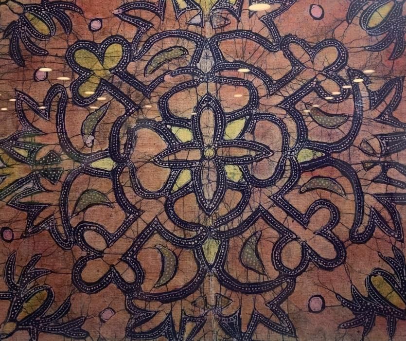 蜡染的制作过程:用蜡刀蘸熔蜡,绘花于布上,以蓝靛浸染,染去蜡后,布面就呈现出蓝底白花或白底蓝花的多种图案,而作为防染剂的蜡会自然龟裂,使布面呈现特殊的“冰纹”,极具特色。
