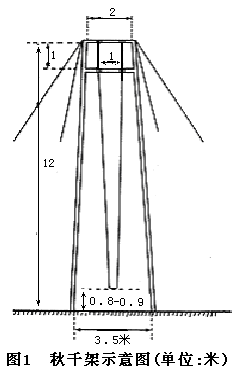 秋千架:用钢管或相应的坚固材料制成。两根立柱下端间距不少于3.5米,上端间距2米,两立柱顶端为第一横杆,距地面高度为12米;往下1米处为第二横杆。秋千架应牢固地安装在场地中央,间距均从内沿丈量。(图1)