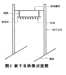系铃架:与秋千架平行、并可随意升降、前后移动的系有铃铛的架子,是高度和触铃比赛判定成绩的标志。系铃架两根立柱的间距应不少于4.5米,并相互平行。从系铃架顶端悬下一根3米长的横杆为系铃杆。系铃杆上用线绳系有若干铃铛。(图2)