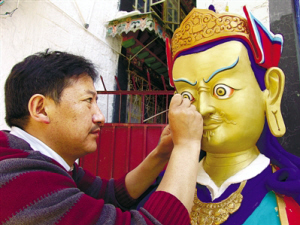 10年时间,边巴不仅在哲蚌寺学得了传统技艺,而且让他在深山古庙磨炼了静心处世的个性。边巴说:“泥塑佛像制作时一定要按照标准进行,就像画唐卡一样,同样要把《造像度量经》牢记在心里,在制作时要不停地默背佛像的尺寸大小,所以你看这些已经制作好的泥塑佛像在轮廓上都是固定的,只是在一些装饰品上有所不同。制作一幅泥塑面具自然也是这个道理。”