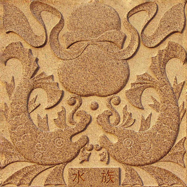 双鱼托葫芦,是贵州水族石雕中常用的图案,反映了水族传统文化中祖先崇拜和动物崇拜、植物崇拜的原始宗教信仰观念。