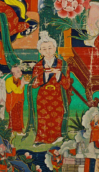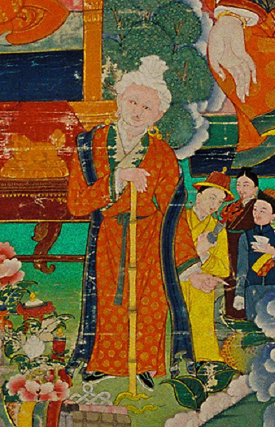 噶尔·东赞(?—667)也是松赞干布时期的大臣,世出蒆(xue)氏,曾奉命为赞普赴长安向唐太宗请尚公主,并迎护文成公主入藏,此外还帮助藏王制定法律、划分千户和四翼,以及区分奴隶为生熟两类等等。晚年多活动于吐谷浑和吐火罗地区,公元667年卒于日布。他是吐蕃著名政治家、军事家和外交家,曾担任过大论之职。(《旧唐书 吐蕃传》载:“相为大论、小论,以统理国事。无文字,刻木结绳为约。虽有官,不常厥职,临时统领。”)在吐蕃王国时期,这个职位相当于首相,有代替赞普行使行政管理之权,亦可行使点集兵将、征集粮食、核定劳役等行政管理权。后因权限过于庞大而被拆分,形成多人同时担任大论的内阁制,内阁集体对赞普负责。噶尔·东赞在建立吐蕃政治、经济制度方面多有建树,在此唐卡中他的形象为拄杖的一位老者。