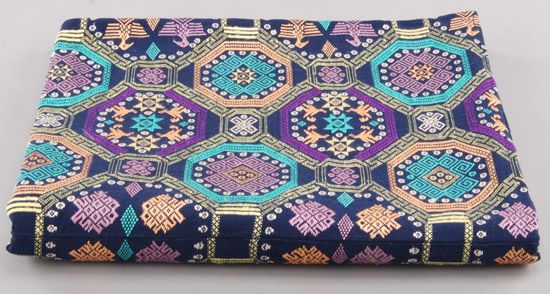 形态特征:凤鸟鱼纹壮锦背面以深蓝色棉纱为经,以蓝色、紫色、黄色、桃红色丝绒为纬,采用通经断纬的织锦工艺织就而成。图案以几何形、菱形为骨架,中间织有云雷纹、双鱼纹、凤鸟纹、太阳纹等吉祥纹饰,体现了勤劳、聪慧壮族的妇女对美好生活的向往。