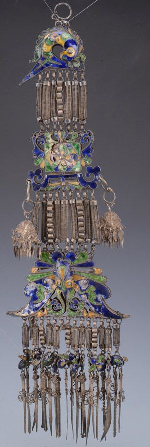 形态特征:苗族烧蓝银胸吊牌上部为鱼形,中部为蝶形,中间用数条银丝相连。蝶下坠鸟形吊坠,鸟坠下垂刀、剑、牙签、挖耳勺等。
