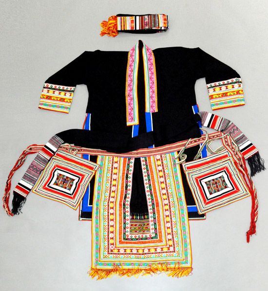 形态特征:1套6件:挑花包头帕,挑花男上衣,挑花腰带,挑花围裙,哈袋1对。贺州尖头瑶男子婚礼服色彩艳丽,1套6件,包括头帕、上衣、围裙、盘王印背袋、腰带等,均采用挑花工艺刺绣而成。纹样以二方连续为主,工整精细,体现了瑶族妇女高超的刺绣水平。