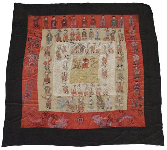 古代军队里的大旗,与正方形帅字旗、长方形三军令旗一样都是表示元帅及大本营所在地的。上下两边有齿牙边,分红黄绿白黑五色,齿牙边有与旗同色和不同色两种;旗心绣飞龙图案,旗边绣回纹或火焰纹,为军旅帅营旗帜。上有飘带,可作行进及列阵表演。