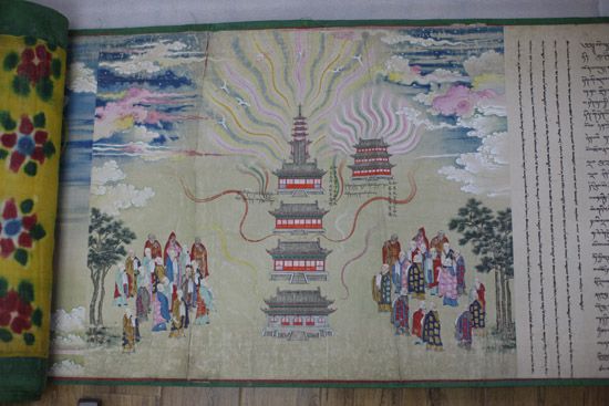 该图卷共计绘图49幅,内容是“荐福”时出现的各种祥瑞景象,或彩云缭绕、豪光映照,或罗汉、仙人降临。并附22段由汉文、察合台文(即回回文、波斯文)、回鹘文(即畏兀儿文)、藏文、蒙古文(回鹘式蒙古文)组成的图注,均为描述和歌颂这次荐福活动的灵瑞之兆和取得的丰硕成果。长卷的整个画面结构严谨、笔锋细腻、人物楼阁描绘栩栩如生,是当前西藏保存最大型、最完整而弥足珍贵的绘画精品.