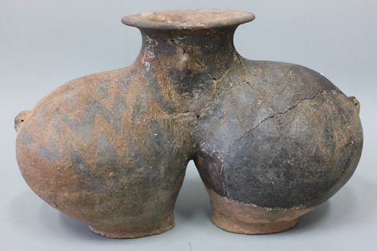 双体陶罐出土于西藏自治区昌都卡若遗址,距今已有4000多年历史。因器形为两件完全相同的袋形陶罐连接而成,故名为“双体陶罐”。其肩颈部穿系绳索的一对带孔器钮有如动物的耳和尾,从而巧妙地把双体陶罐勾勒成两只相向而立的小兽,造型雍容大气而极具生活情趣。双体陶罐通体打磨,表面饰以大量刻划纹和朱、墨两色彩绘,所以也称为“朱墨彩绘双体陶罐”。