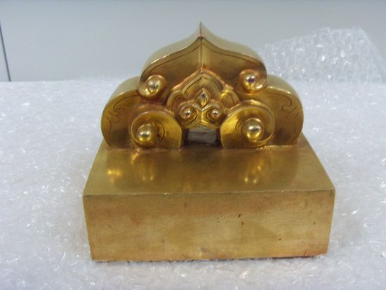 此印为纯金铸就,印文为汉、满、藏、蒙四种文字刻写的“西天大善自在佛所领天下释教普通瓦赤拉呾喇达赖喇嘛之印”。此封号始自顺治皇帝册封五世达赖喇嘛,此后历辈达赖喇嘛均获授此封号。按照习惯,封号字数越多,持有人地位越高,24字封号在历朝赐号中都是极为少见的,可见清朝统治者对格鲁派的重视程度以及对藏传佛教领袖的殊荣。历史上,清朝中央政府曾先后封授五世、七世、八世达赖喇嘛金印,但目前仅有这枚金印存世,因而倍加珍贵,是清朝中央政府封授达赖系统、有效行使主权的代表性物证。