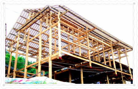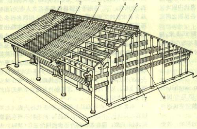 因此,为了兼容二者的优势,也有采取将穿斗式构架与抬梁式构架相结合的办法:即在山墙部分使用穿斗式构架,当中的几间用抬梁式构架,彼此配合,相得益彰。