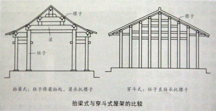 相比之下,穿斗式木构架用料小,整体性强,但柱子排列密,只有当室内空间尺度不大时(如居室、杂屋)才能使用;而抬梁式木构架可采用跨度较大的梁,以减少柱子的数量,取得室内较大的空间,所以适用于古代汉族宫殿、庙宇等建筑。