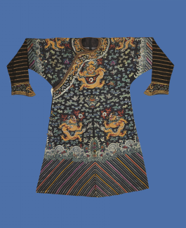 这件男式蟒袍为满、汉族官服。大襟右衽、袖头呈马蹄形,故称“马蹄袖”。袍身绣蟒纹、鹤蝙蝠,下摆绣立水纹,(又称“海水江涯”),间饰云、蝠、鹤等纹饰。蟒袍为皇子、皇子福晋,下至文武品官及命妇专用服饰,清朝在明朝的基础上形成了一套完整的服饰制度,以其服装颜色及所装饰的蟒纹数目多寡辨等级。蟒袍三品以上绣九蟒、四至六品绣八蟒、七品以下绣五蟒。此件蟒袍为四开裾九蟒蟒袍,前后各三蟒、肩部两条过肩蟒、另有一蟒藏于右襟内侧下摆。清朝官服有吉服袍和便袍之分,区分的依据是便袍没有马蹄袖,而吉服就是有马蹄袖。这件属于吉服袍。