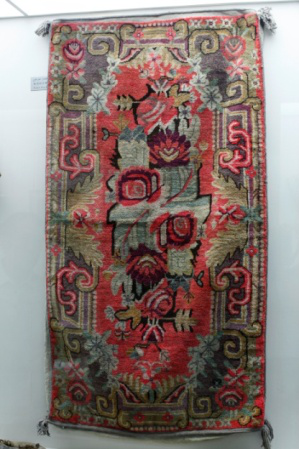 绣花毡,这是在彩色的毛毡上精心绣上纹样的花毡,所用的主要料材是彩色丝线。