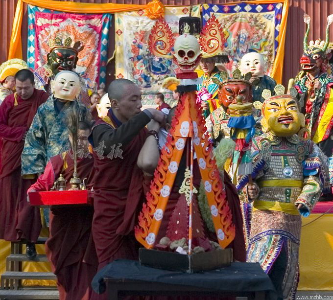 第五幕跳尸陀林主舞,尸陀林主即尸林之神,是上乐金刚的护法,以三目骷髅面,头戴五骷髅冠,头两侧有扇形蝶翅为特征,故俗称“蝶神舞”,藏语称“契代巴代”,又名“墓葬主”。由四名身材瘦长的年轻僧人扮演,他们身着绣有红条纹的白缎紧身小袄,红兜肚,盘金绣花红围裙,裤、鞋、手套都是红白相间,胸前配有璎珞。四人舞姿轻盈,动作敏捷,张臂作飞行状,四处搜寻,终将魔鬼捕获。他们耳后的五彩冠翅,随着飞舞跑动的动作而上下颤动;他们游走飞翔于地上地下,表达上乐金刚化为护法神来享用战胜邪魔之血肉的快乐形象。