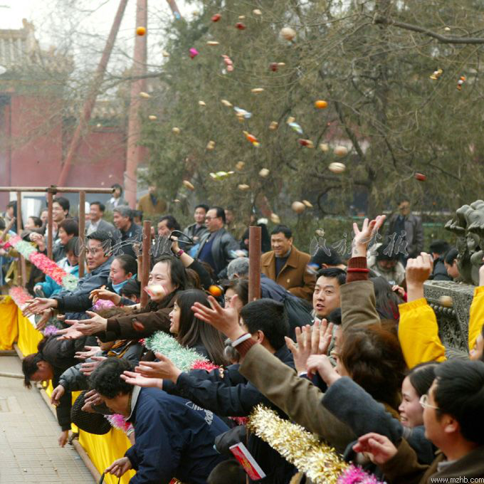 仪式结束后,象征吉祥的“胜利果”撒向观舞的人群
