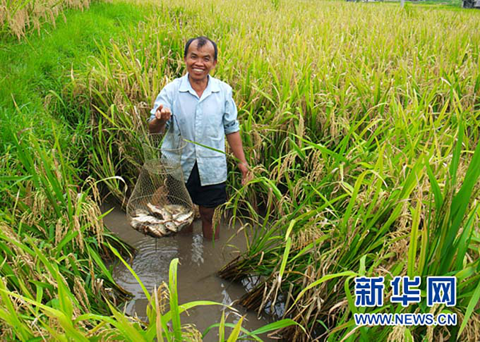 贵州省黔东南苗族侗族自治州的稻田鱼生态养殖(新华网)