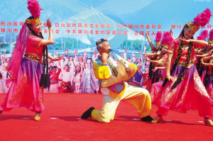在2018宁夏“民族团结月”启动仪式上,各族群众载歌载舞。