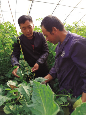 和润村党支部成员在大棚里教村民管理蔬菜。张国欣摄