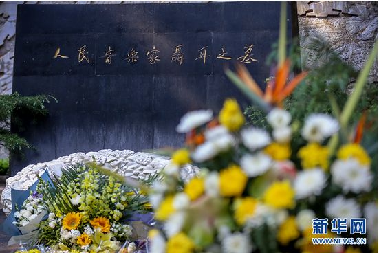 聂耳墓前摆放了黄色和白色的鲜花(新华网 张楠/摄)