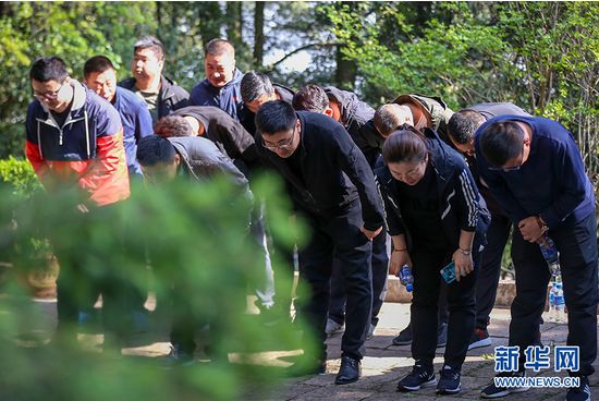 中国二冶集团有限公司的职工们在聂耳墓前鞠躬(新华网 张楠/摄)