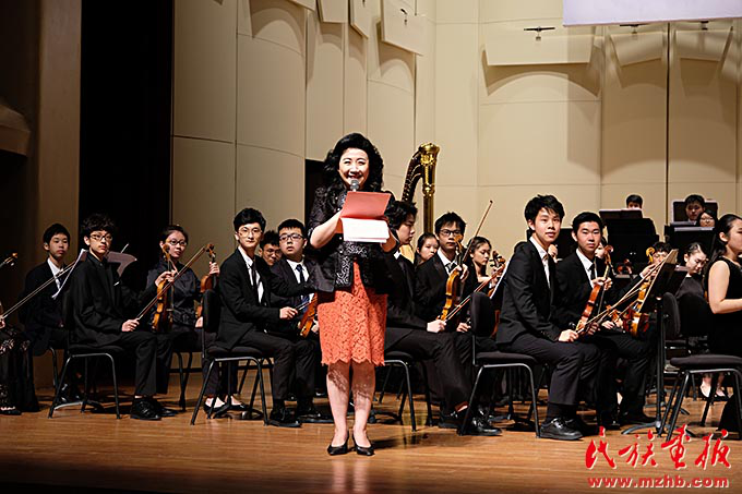 娜木拉在中央音乐学院附中少年交响乐团成立60周年庆典活动上发言。