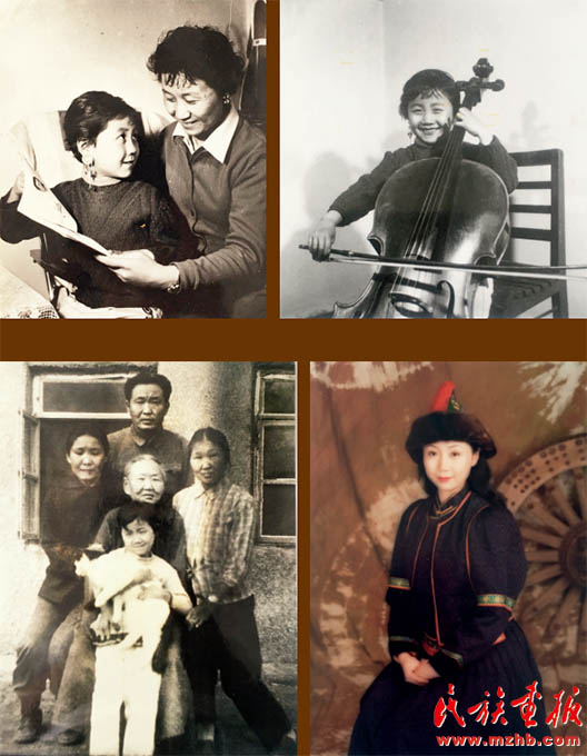 左上:童年的娜木拉和母亲;右上:娜木拉从小坚持勤学苦练;左下:娜木拉的父亲苏日巴图是大提琴、马头琴演奏家,她从小受到了家庭的艺术熏陶;右下:身着鄂温克族服饰的娜木拉。