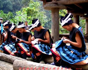 瑶族蜡染 瑶族蜡染的主要原料有蓝靛、蜂蜡、白布、蘑芋等。染布用的原料是靛蓝草,荔波境内一带盛产靛蓝草,把蓝草叶放在水缸里发酵,便成为蓝靛。布料多用自己纺织的白色土布,有麻布、棉布等。所有的蜡以黄蜡(蜂蜡)最好,蜂蜡是蜜蜂蜡腺的分泌物,不溶水,但加热后可以融化,有时也掺和白蜡使用。蜡染技术在瑶族妇女中代代相传,是瑶族妇女必须掌握的一项技艺。其制作方法很简便,步聚是:1、融蜡:用蜂蜡拌上白蜡,放在一个小瓷碗或罐里,用火盆里的木炭灰或糖壳小火使蜡融化,便可以用一种特制的铜蜡刀蘸蜡。2、绘图:把要染的白布铺在木板上,用钢刀蘸熔蜡绘各种花纹于白布上。更进步的是在模上已做好图案,仅在上面刷上蜡即可。3、染布:通常用靛蓝染,是把画好的蜡片放入一个蓝靛大池中,进行靛染。每次泡10多分钟,共三至四次。第一次浸泡后取出晾干,为浅蓝色。再浸泡数次,便逐渐成为深蓝色。如果需要在同一布料上同时有深浅两色图案,在第一次浸泡后,就在浅蓝色上再点绘蜡花浸染,染成以后即现出深浅两种层次丰富的花纹。4、退蜡:把用靛染好的布料放入大锅中,用沸水煮这些布料,边煮边用木棍翻布,使蜡完全溶去,美丽的花纹图案就出现在布料上了。5、晒干:把布料晾在院中,在阳光下晒干即可。以后即可用于制作各种服饰。气候冷时,蜡染的布会出现裂纹,所以一般要在气候较热的季节进行蜡染。但也有有意要裂纹的。在制作中,利用蜡冷冻后产生裂纹(冰纹)的特征,掌握好冰纹的粗细、疏密、走向,使其恰到好处地表现物像,同时采用分色封蜡,丰富色彩层次等手段,增加蜡染图案的艺术效果。蜡染产品的制作和使用在瑶山瑶族当中世代相传,瑶族常用蜡染布制作衣服、头巾、背包、裙子、围腰、头帕、绑腿等。妇女和民间艺人的制作的产品多为自用,具有乡土气很浓的民间艺术特点。