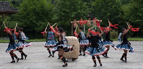 猴鼓舞 猴鼓舞是流传于瑶山白裤腰地区的传统祭祀舞蹈,源于猴子救助白裤瑶祖先的故事,传说瑶山白裤瑶从广西迁入荔波经捞村,经遇危难得到一群猴子的解危护救。后人为了纪念祖先迁徙之苦和猴子护救之功,模仿祖先爬山涉水的情景和猴子攀爬跳跃护救祖先的神情姿态舞蹈起来,葬礼上人们以舞蹈祭祀祖先和护送亡灵,祈求亡灵平安归西。舞蹈以模仿猴子各种姿态神情为基本特点,其动作有“三击鼓面”、“莲花”、“反背”、“穿脚”等,粗犷拙朴,节奏强烈。木鼓与铜鼓的合奏更是雄沉苍凉,回荡在山谷,犹如天地共鸣。舞蹈充分表现原始朴素的自然以及天地人完美统一的至高境界。2008年《瑶族猴鼓舞》被列入国家级非物质文化遗产名录。