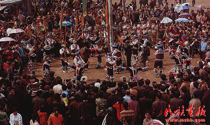 上午11点左右,各族群众从四面八方赶到会场,深藏于群山之中的古龙坡顿时热闹起来。平日寂静的山坡此时变成了芦笙的森林、花伞的海洋。坡上高高地竖立起数十根芦笙柱,一支支芦笙队围绕着它们整装待舞。“古龙坡会”的活动内容丰富多彩,最吸引人的项目就是吹笙踩堂和斗马了。