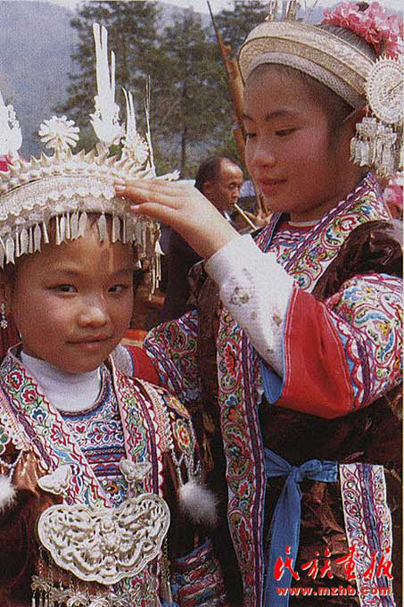 中午时分,四周响起鞭炮声,各支芦笙队开始吹笙踩堂。碗口粗的地筒 (芦笙的一种)浑厚深远,高高的大芦笙高亢激扬。苗族芦笙手们吹起小芦笙,随着笙曲的节奏,时而左右摇摆,时而转体跳跃,让你真正体会到苗族男子汉的魅力。姑娘们身穿五彩斑斓的百褶裙,颈挂银项圈,头戴银花冠,伴随着芦笙踏乐而舞。姑娘们时而点足轻如絮语,时而快步飞速旋转,手中的毛巾与花朵上下翻飞,整个人就像一只只轻盈欲飞的蝴蝶。芦笙舞跳到酣畅淋漓处,姑娘们和芦笙手默契配合,你左我右,穿插有序。