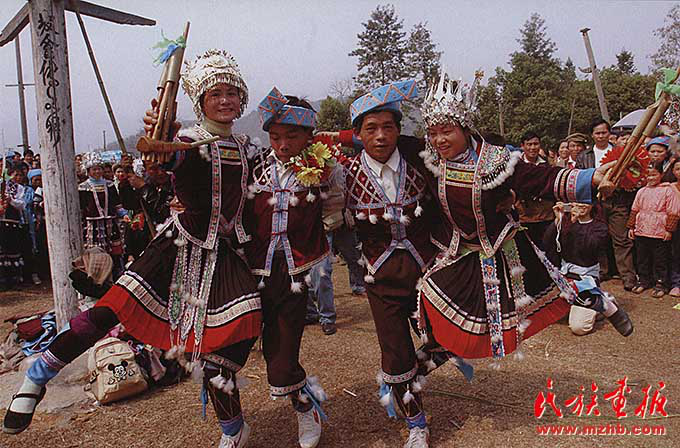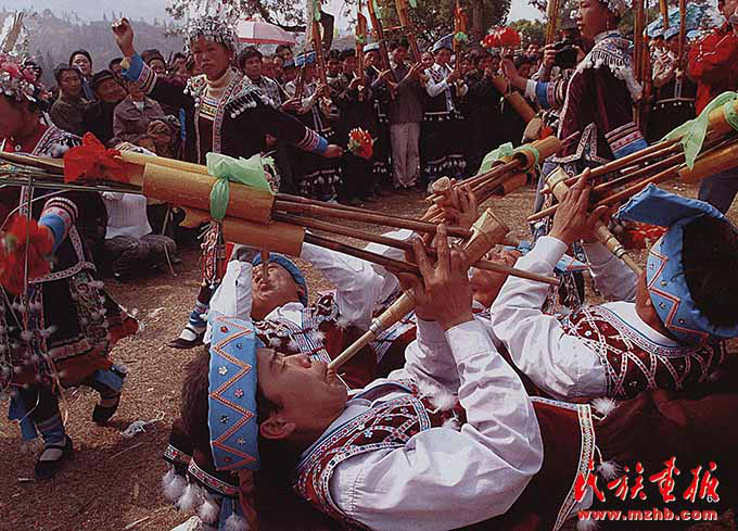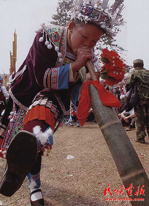 “古龙坡会”上,苗族小伙子的吹芦笙表演