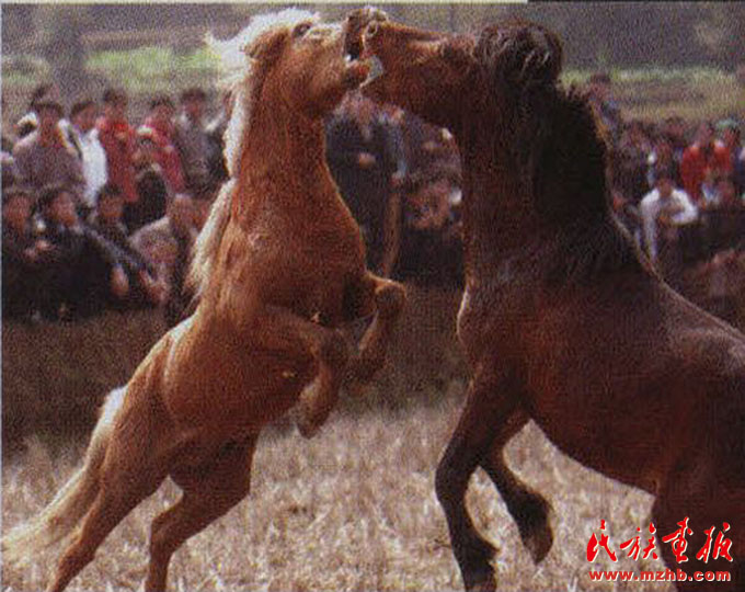 “古龙坡会”上的斗马是不能不看的。斗马场上,只见两只马儿昂首翘尾,勇猛地扑在一起。它们高抬前蹄,奋力撕咬,赛场上烟尘滚滚, 泥沙飞溅。马儿时而挺立龇牙对峙,前蹄搏击;时而扬蹄嘶叫,震慑对手;时而奋蹄直追,疾如闪电;时而跌扑在地,滚成一团。经过一番苦斗,输者狂奔逃窜。有的马匹交锋几个回合,就能分出胜负,有的则要斗几十个回合才见分晓。败者退出,胜者又与新上场的马再斗,直到最后分出胜负。