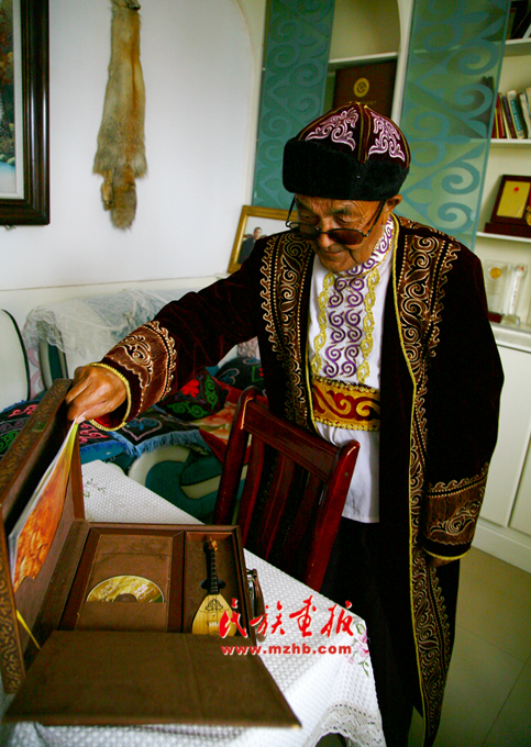 在齐勒哈仁村,公路上便能看到有个蓝色穹顶的建筑,这是2010年国家出资30万给老人盖的新家,之前,哈孜木一家一直在戈壁深处的乌伦古河河谷以放牧为生。进屋来,客厅一面墙上挂着三件刺绣长袍,另一侧的书柜里面放着老人得过的各种奖章、奖状。老伴身体不好在休息,儿子一家和老人住一起。我这才注意到跟着我们进来、刚才也在文化中心学唱的一个男孩,原来是老人12岁的孙子波拉提。老人说孙子学了两三年,现在也可以唱些简单的了,对孩子来说,难度大的还是有些段落太长,非得有好记性才可以。老人从书柜里给我们拿出了参加录制的影像资料、演出的节目单。近几年,新疆为了配合启动国家级重点课题“史诗百部”工程,对哈萨克、维吾尔、柯尔克孜、蒙古等四个民族的民间长诗进行了普查采集试点,哈孜木老人作为全疆哈萨克族民间达斯坦的传承人,参与录制了大量影像资料。为使民族瑰宝得以延续和传承,福海县也对哈孜木的120首达斯坦进行抢救性录音,制成了20小时的CD;编辑整理了哈孜木·阿勒曼的诗歌作品,编校出版了《哈萨克族民间达斯坦》。2012年大型歌舞剧《乌伦古达斯坦》成功上演,次年又成功举办了哈萨克达斯坦文化研讨会,福海县也得到了“哈萨克族达斯坦之乡”的荣誉称号。