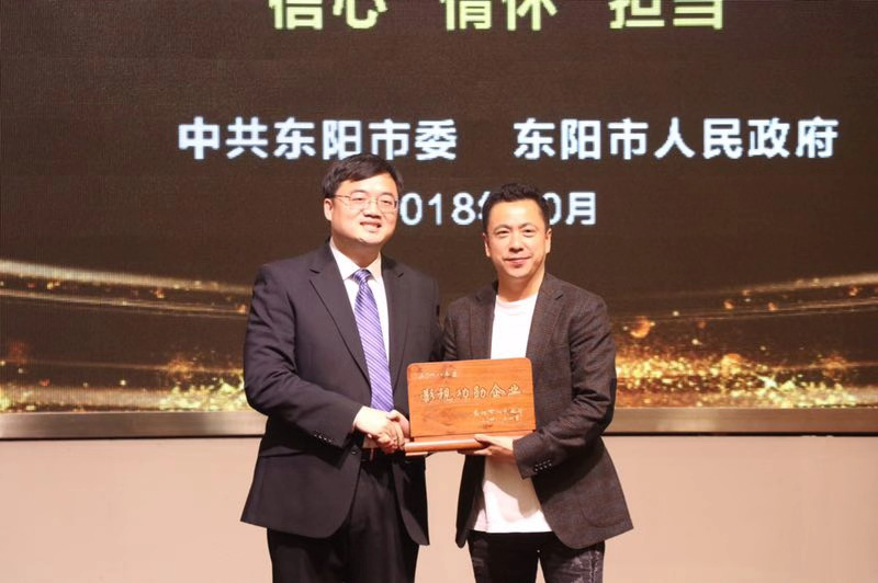 金华市副市长、东阳市委书记黄敏向华谊兄弟副董事长、CEO王中磊颁发“2018影视功勋企业