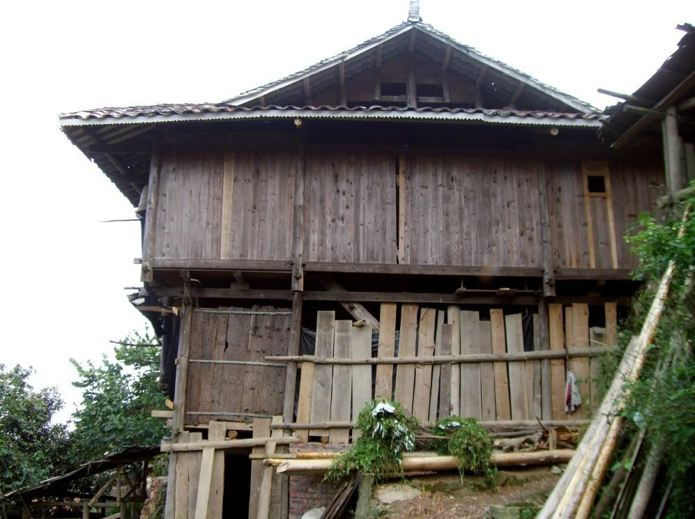 岜沙村传统民居体量较小,一般分为矮吊脚楼和楼房吊脚楼矮吊脚楼不设置底楼,一般在距地面50cm的柱子上穿枋、铺枕镶楼板,以隔地防潮,屋内结构与设置基本与楼房相同。楼房般为三层,底层墙板横装,主要用来关养牲口、家禽和堆放柴火肥料,二层设火塘、长廊、卧室,三层放置杂物。岜沙禾仓也是用杉树作材料建造而成,悬山屋顶,上盖杉树皮或小青瓦,四柱落地呈方形或长方形。