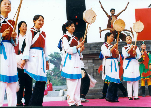 在香格里拉白地一带的纳西族女性,喜穿开敞口秀边的长褂配百褶裙,腰系羊毛织彩带,脚穿云头黑靴,背披白山羊皮所制的披毡,传统氐、羌系游牧民族服饰特点非常突出。