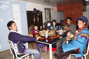 用上装饰着彝族传统纹饰的餐桌和板凳,开心地吃起坨坨肉。俄底尔以摄