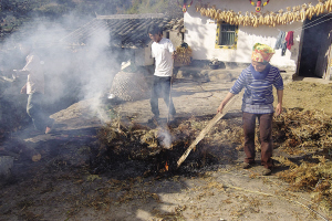 彝家人褪猪毛的方式比较独特,不使用开水冲烫,而是把猪放在草堆上用火烧,然后再用刀刮去猪毛。草堆被点燃后,猪肉的香气便弥漫在空气里。