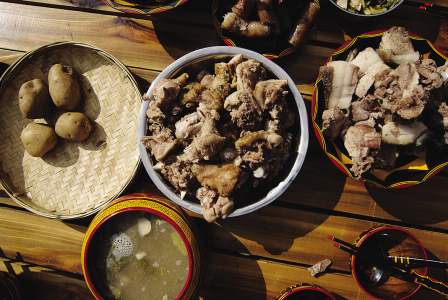 彝家人过年除了吃坨坨肉外,大多还要吃鸡肉。这一天,家家桌上肉多多,素菜一般仅有一盆酸菜汤,这是解油去腻的美味。