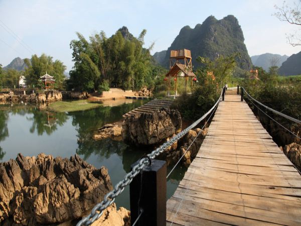【水资源】  都安地表河流属珠江流域西江水系。集雨面积在20平方公里以上的河流共10条,其中正常流量大于25立方米每秒的有红水河、刁江、澄江三条河流。全县地下河系有25条,干支流共80条(其中支流55条),主流总长为445.2公里,集水面积388l平方公里,最大总流量大于921.9立方米/秒,最枯总流量为14.273立方米/秒,年径总流量36.10亿立方米。枯水期流量大于1立方米每秒的地下河有地苏、中旧、下里、王岐、帮祖、大兴6条,流程10公里以上的地下河有地苏、帮祖、大兴、拉楞、中旧、下作、下里、带河、何家、岜马、永仁、牛角、九楞、王岐、九渡、拉烈等17条。其中地苏地下河系为广西最大的地下河系之一。水能资源丰富。全县水能蕴藏量为4万千瓦(不含红水河和地下河),可开发量为1.68万千瓦,占理论蕴藏量的42%;全县已开发1.06万千瓦,占可开发量的63.1%(图为地苏瑶台景区一角)。