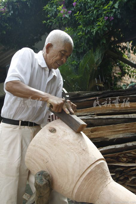 如今,青华村会制作象脚鼓的艺人大多都上了年纪,而制 作象脚鼓是个耗时间又费体力的活儿,年轻人大多不愿学习, 加之古树资源逐年减少导致制作成本逐渐增高,传统象脚鼓的制作技艺已濒临失传的处境。