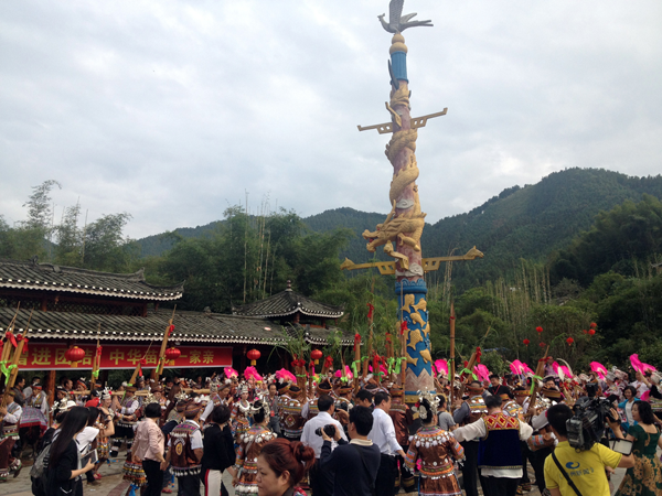 3.奇古淳厚的民族风。独具特色的苗寨、民居。苗寨多傍山依水,一个村屯十多户到几十户不等,远望鳞次栉比,颇为壮观。建筑采用吊脚楼形式,全用杉木建成,不需一钉一铆。柱子端和前门上沿用古老习俗,雕龙刻凤,画花描草,虫、鸟、鱼、兽无所不有。尤以村屯文化中心芦笙坪上均坚雕龙绘凤的芦笙柱,展示出苗族文化关系与异质文化特征,具有较高的旅游观赏价值。