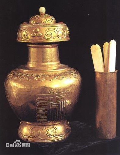 金瓶掣签,又称为金瓶鉴别,是藏族认定藏传佛教最高等级的大活佛转世灵童的方式,清王朝乾隆五十七年(1792年)正式设立。自清朝以来,藏传佛教活佛达赖和班禅转世灵童需在中央代表监督下,经金瓶掣签认定。