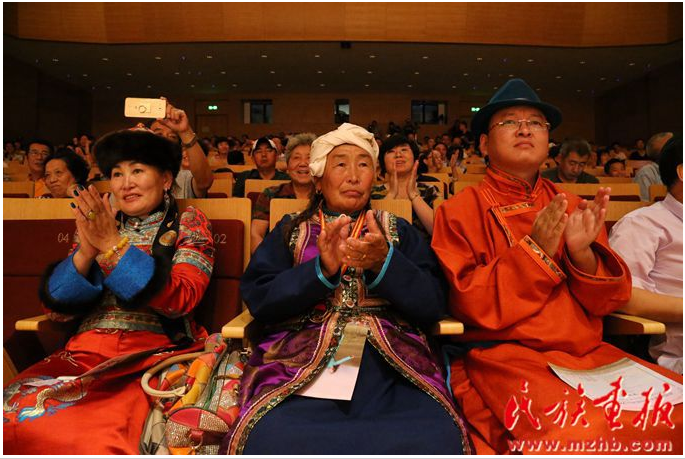 新巴尔虎左旗甘珠尔苏木牧民代表斯布格道尔吉(中)和斯琴其木格((左)一起观看音乐会