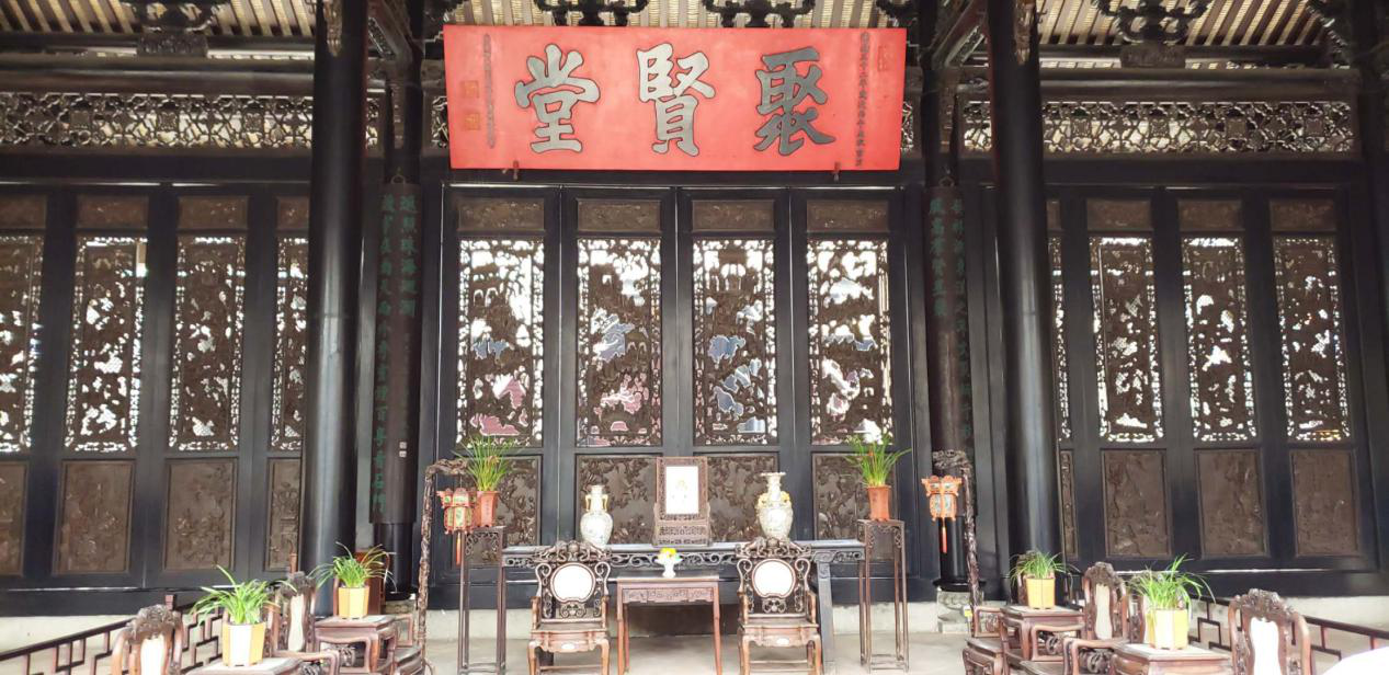 中进大厅聚贤堂为书院建筑的中心,是当年族人举行春秋祭祀或议事聚会的地方。堂宇轩昂,庭院宽敞。梁架雕镂精细,堂中横列的巨大屏风,玲珑剔透,为木刻精品。