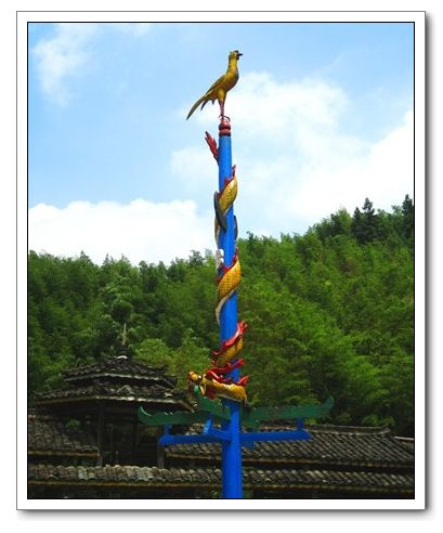 龙模型。缠着柱子尾朝上头朝下的龙,那是出于苗族龙图腾。意思是地上的龙,水里的龙,都朝着我们寨子来,我们寨吉祥大利,人畜兴旺,五谷丰登。