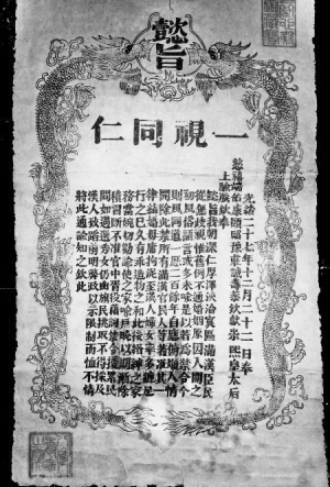 这是一份颁于光绪二十七年十二月二十二日(1902年1月31日)、题为“一视同仁”的慈禧懿旨,宽36厘米,高59厘米,盖有3枚红色印章。